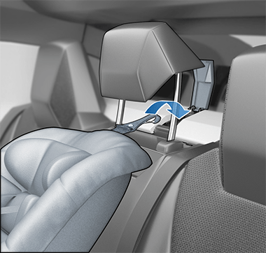 Для центрального сиденья пропустите ремень с одной лямкой между стойками под подголовником. Поднимите подголовник, затем пропустите ремень. Оставьте подголовник в поднятом положении.