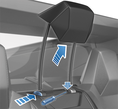 - Вставьте короткий плоский предмет (например, маленькую плоскую отвертку) в отверстие в основании противоположной стойки и потяните подголовник вверх.