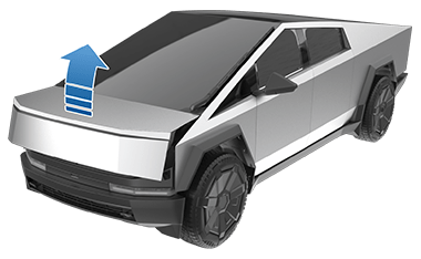 Примечание: В маловероятном случае, если в Cybertruck отсутствует низковольтное питание, вы не сможете открыть передний багажник с электроприводом с помощью сенсорного экрана или кнопки под крышкой капота.