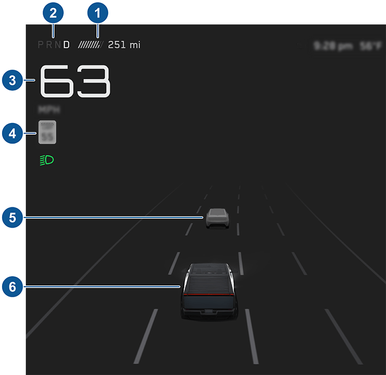 Когда Cybertruck находится в движении (или готов к движению), сенсорный экран показывает текущее состояние движения и визуализацию дороги в реальном времени, как ее видят компоненты Автопилота. Визуализация автоматически увеличивается и уменьшается, чтобы лучше использовать пространство на сенсорном экране и информировать вас о появлении транспортного средства в слепой зоне.