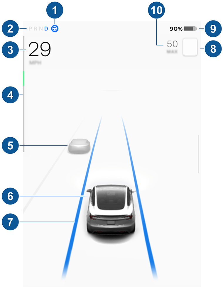 Когда Model 3 находится в движении (или готов к движению), сенсорный экран показывает текущее состояние вождения и визуализацию дороги в реальном времени, как ее видят компоненты Автопилота. Визуализация автоматически увеличивается и уменьшается, чтобы лучше использовать пространство на экране и информировать вас об обнаружении транспортного средства в слепой зоне.