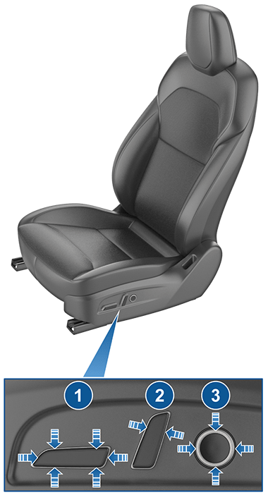 - Перемещение сиденья вперед/назад и регулировка высоты и угла наклона подушки сиденья вверх/вниз.