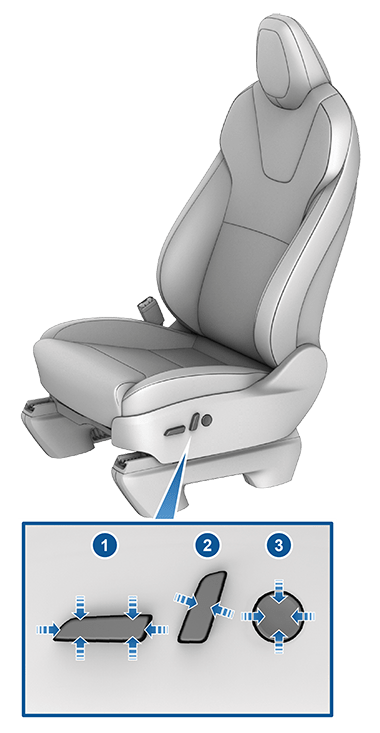 Используйте L-образную кнопку в нижней части сиденья для перемещения сиденья вперед/назад (вверх/вниз на элементе управления) и регулировки спинки, наклоняя верхнюю часть L-образной кнопки вперед/назад.