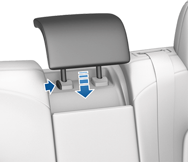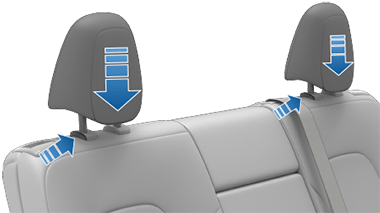 Крайние сиденья второго ряда оснащены регулируемыми подголовниками, которые можно поднимать, опускать или снимать. Когда на одном из этих сидений находится пассажир без детского кресла, соответствующий подголовник должен быть отрегулирован (совместите центр подголовника с центром головы пассажира) и зафиксирован. Чтобы поднять подголовник, тяните его вверх, пока не услышите щелчок. Чтобы опустить, нажмите и удерживайте кнопку у основания стойки, одновременно толкая его вниз.