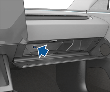 - Один порт USB-A находится в перчаточном ящике. К этому порту подключен USB-накопитель. Безопасное расположение этого USB-порта делает его идеальным для сохранения видеозаписей с режимов «Видеорегистратор» (Dashcam) и «Охрана» (Sentry Mode). Он также поддерживает воспроизведение аудиофайлов с телефона или USB-устройства.