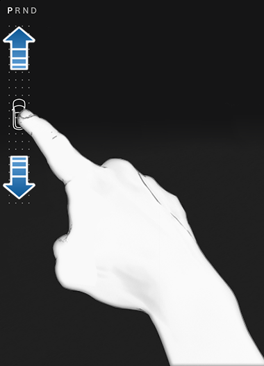 Когда автомобиль припаркован и вы нажимаете на педаль тормоза, на одной стороне сенсорного экрана появляется полоса выбора режима движения. Используйте ее для переключения передач в Model Y: проведите пальцем вверх для включения режима Drive, вниз — для включения режима Reverse или нажмите на полосу для включения режима Park. Каждое переключение передачи сопровождается звуковым сигналом.
